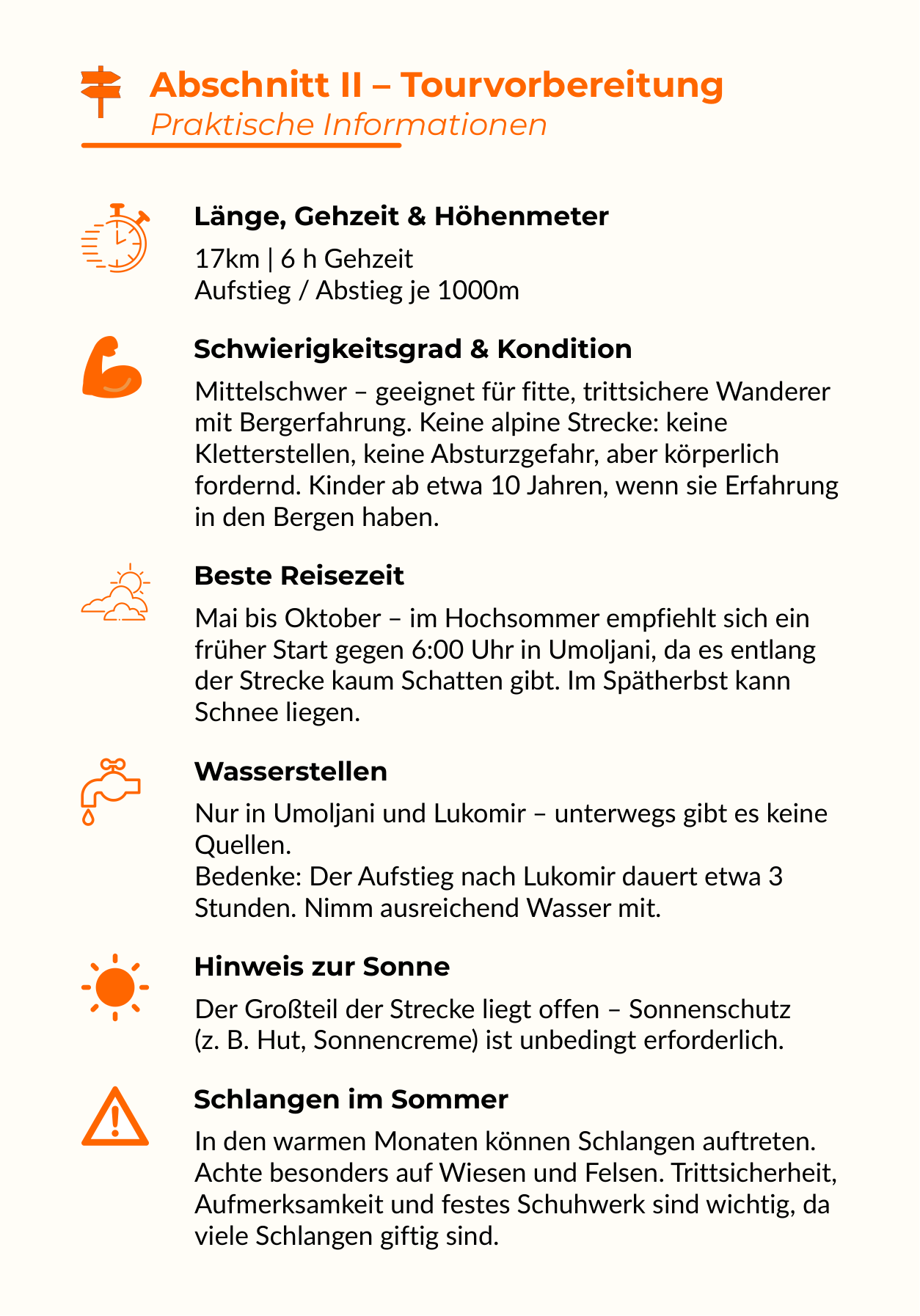 Genau hier entscheidet sich Vertrauen: Länge, Schwierigkeit, Höhenmeter und Kernfakten sind auf einen Blick sichtbar. So sieht der Käufer sofort, dass der Guide konkret vorbereitet statt nur schön gestaltet ist.